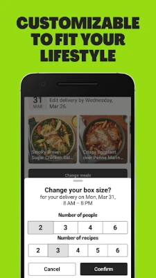 The HelloFresh app makes managing your weekly meal subscription simple. Just access your account on your Android device to manage your delivery day, swap out ingredients and recipes, or change the number of meals or the number of people you are feeding. Perfect whether you’re eating alone or cooking for the whole family!