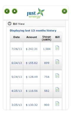 My Just Energy app offers access to view/pay bills, monthly usage & payment history through your phone or tablet device. To get started, download the app and sign in with your "My Just Energy" username and password.